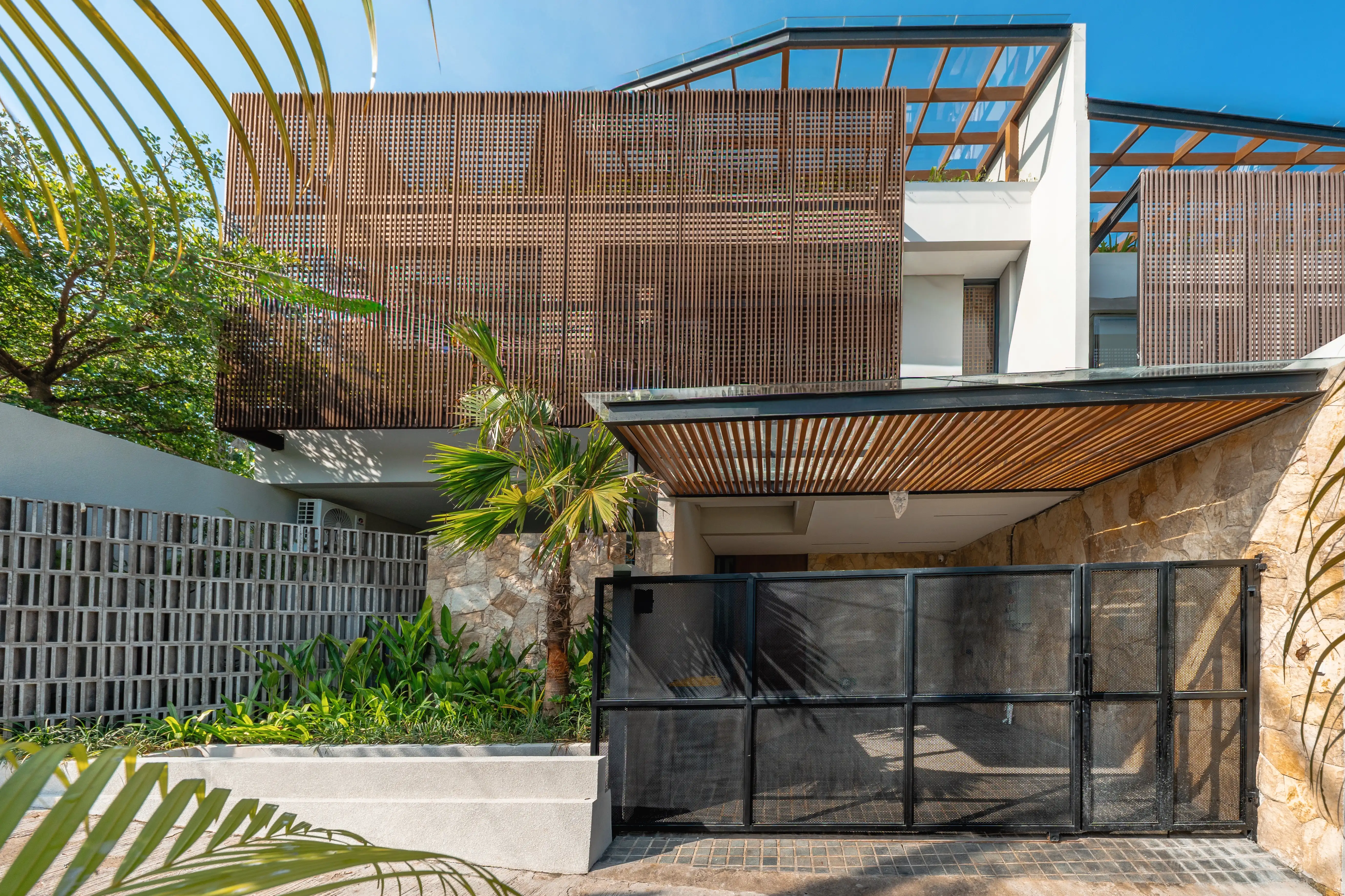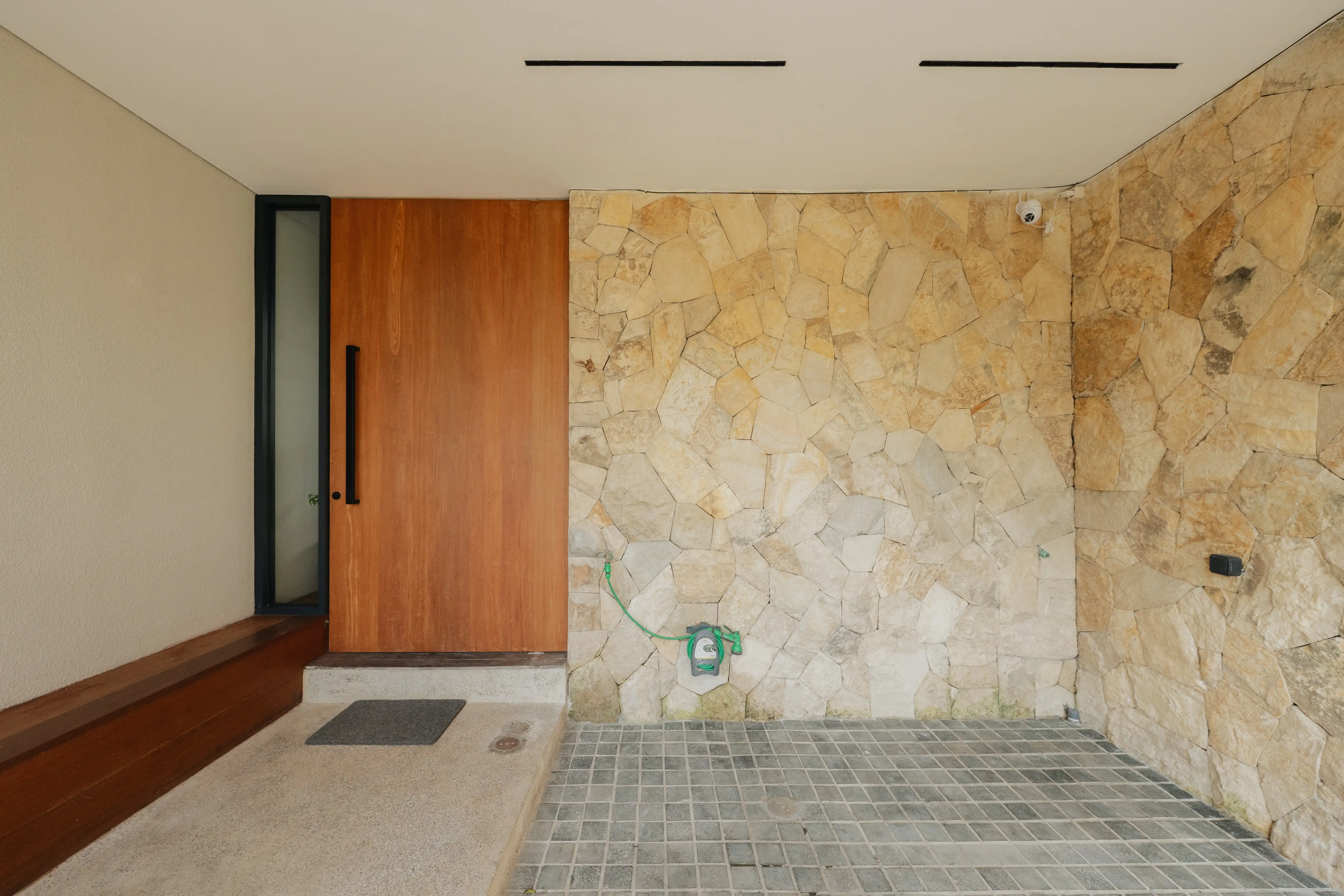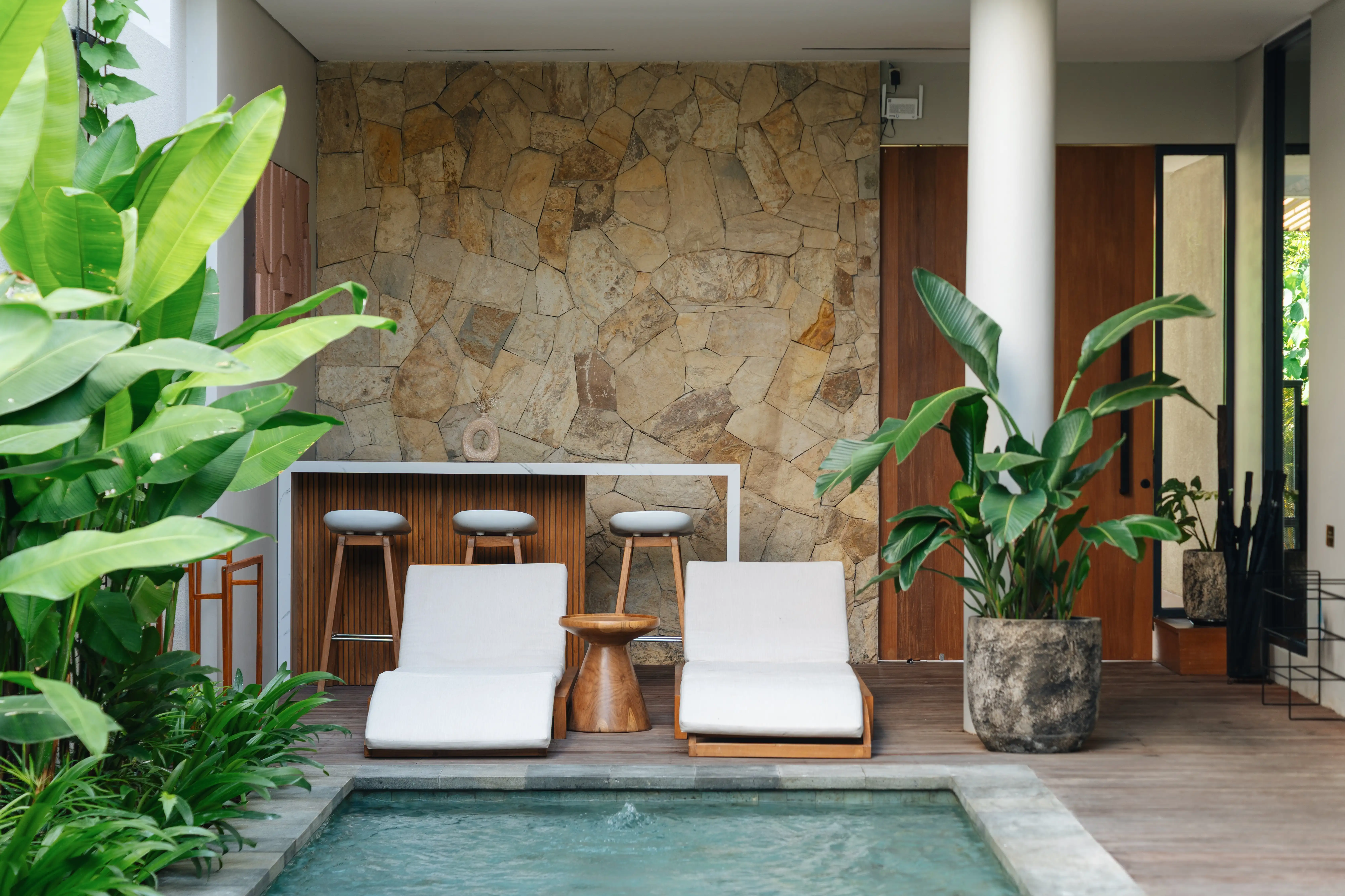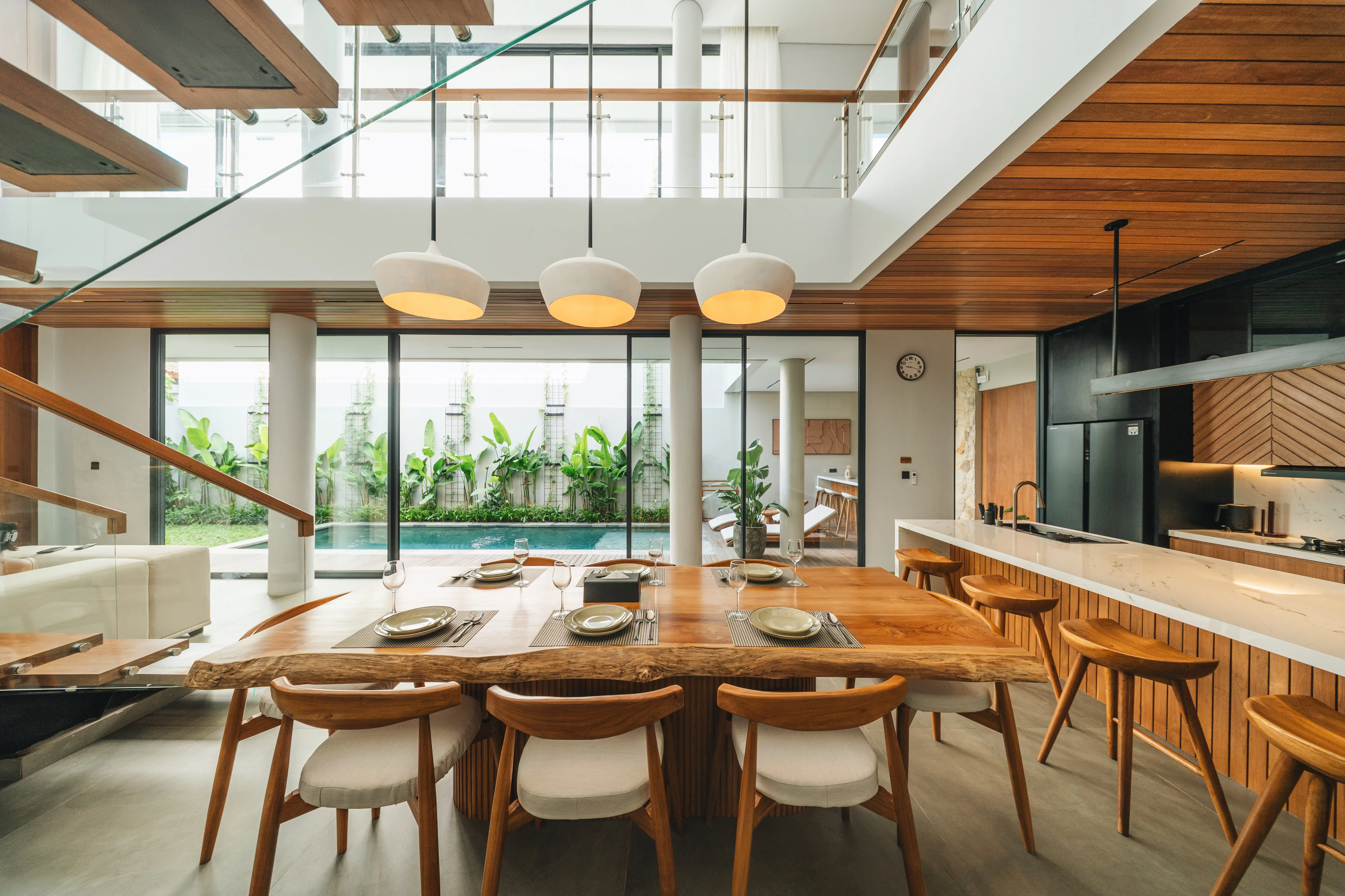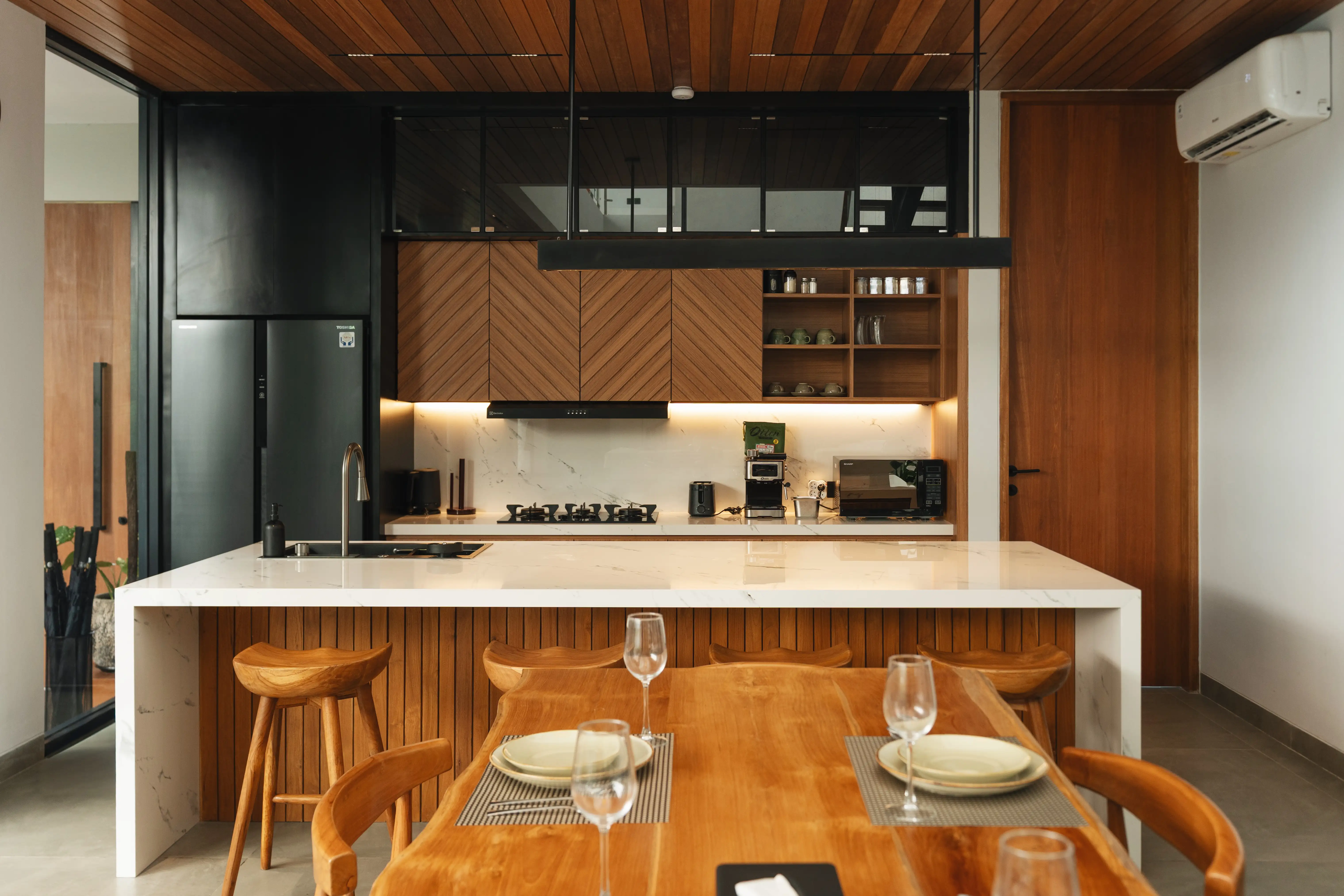 Inside, the villa features three elegant bedrooms and three bathrooms, each designed with a contemporary yet warm style using natural tones, stone accents, and wood textures. The open living and dining area includes a modern kitchen with an island counter, perfect for family meals or hosting guests. Additional facilities include a walk-in wardrobe, laundry and dry area, and a spacious lounge that overlooks the pool. The villa also offers a secure parking area for two cars, ensuring convenience for residents and visitors alike.