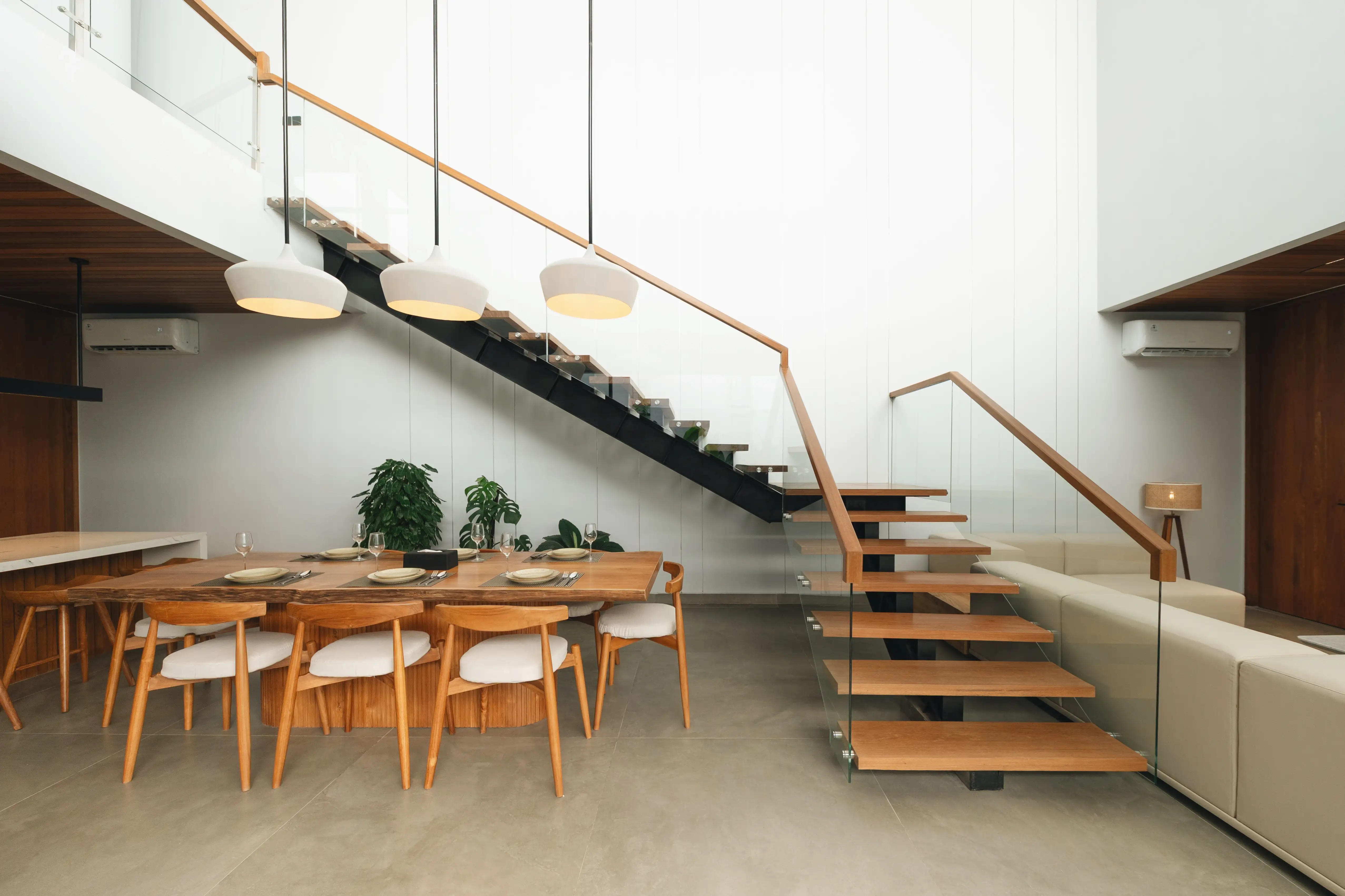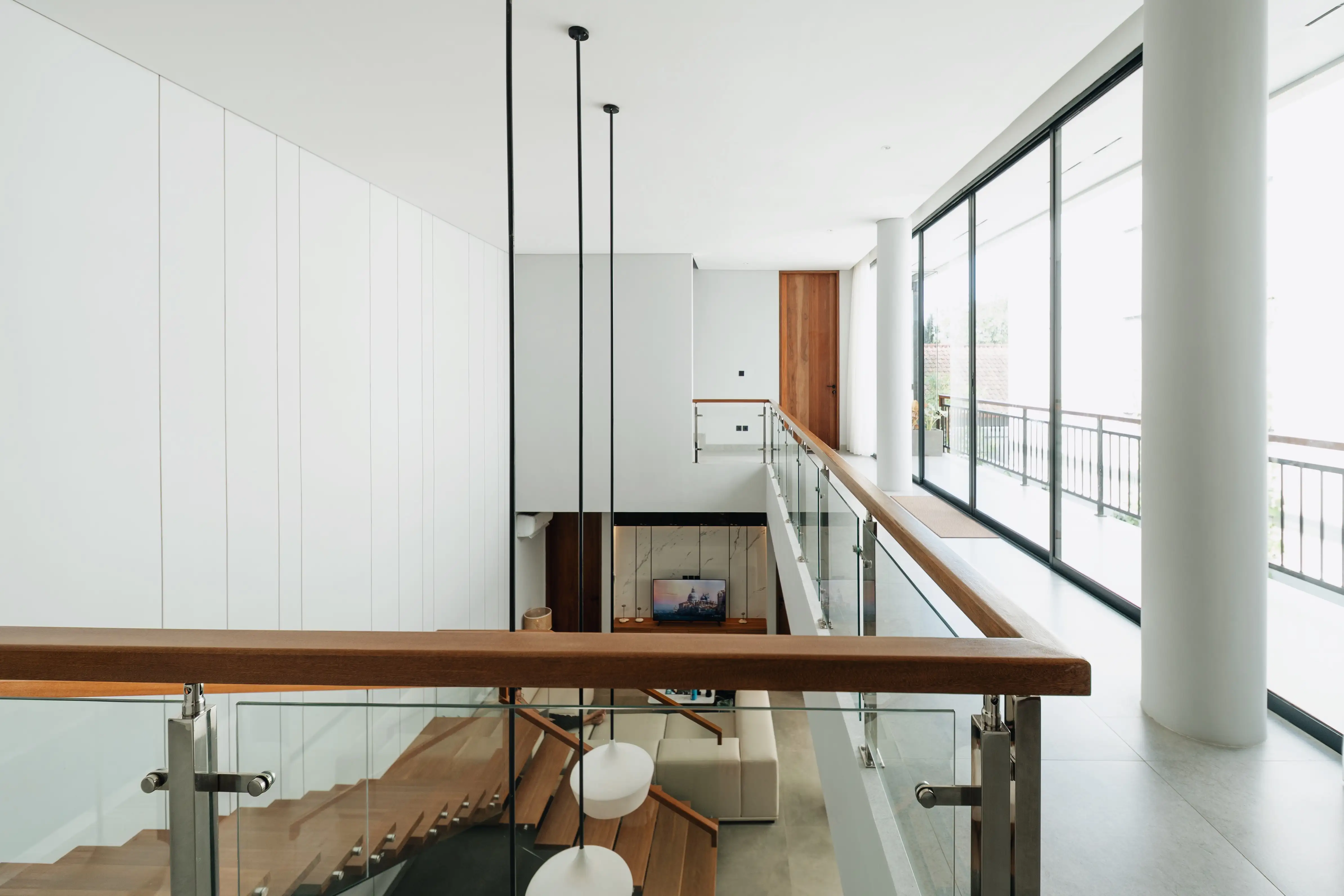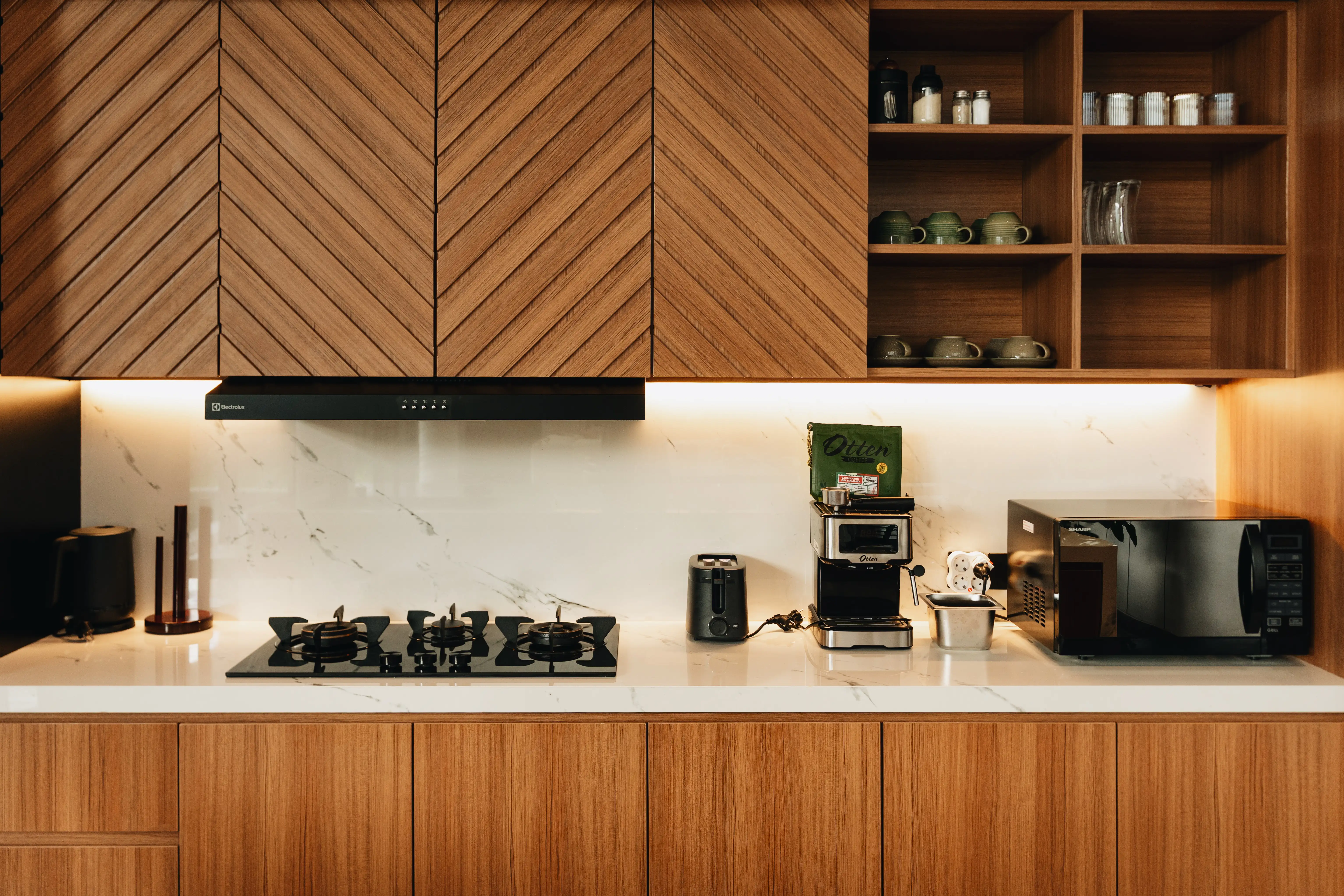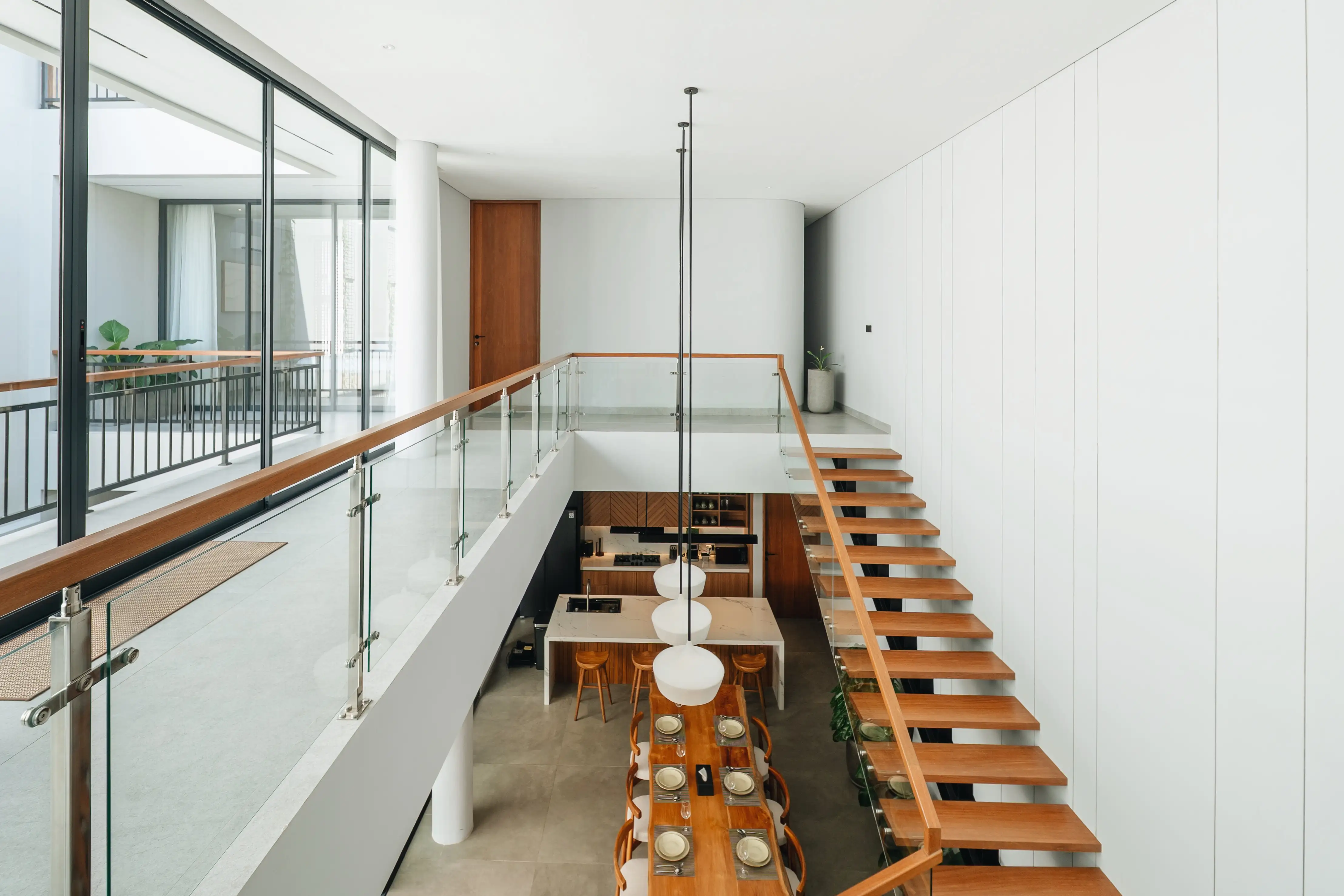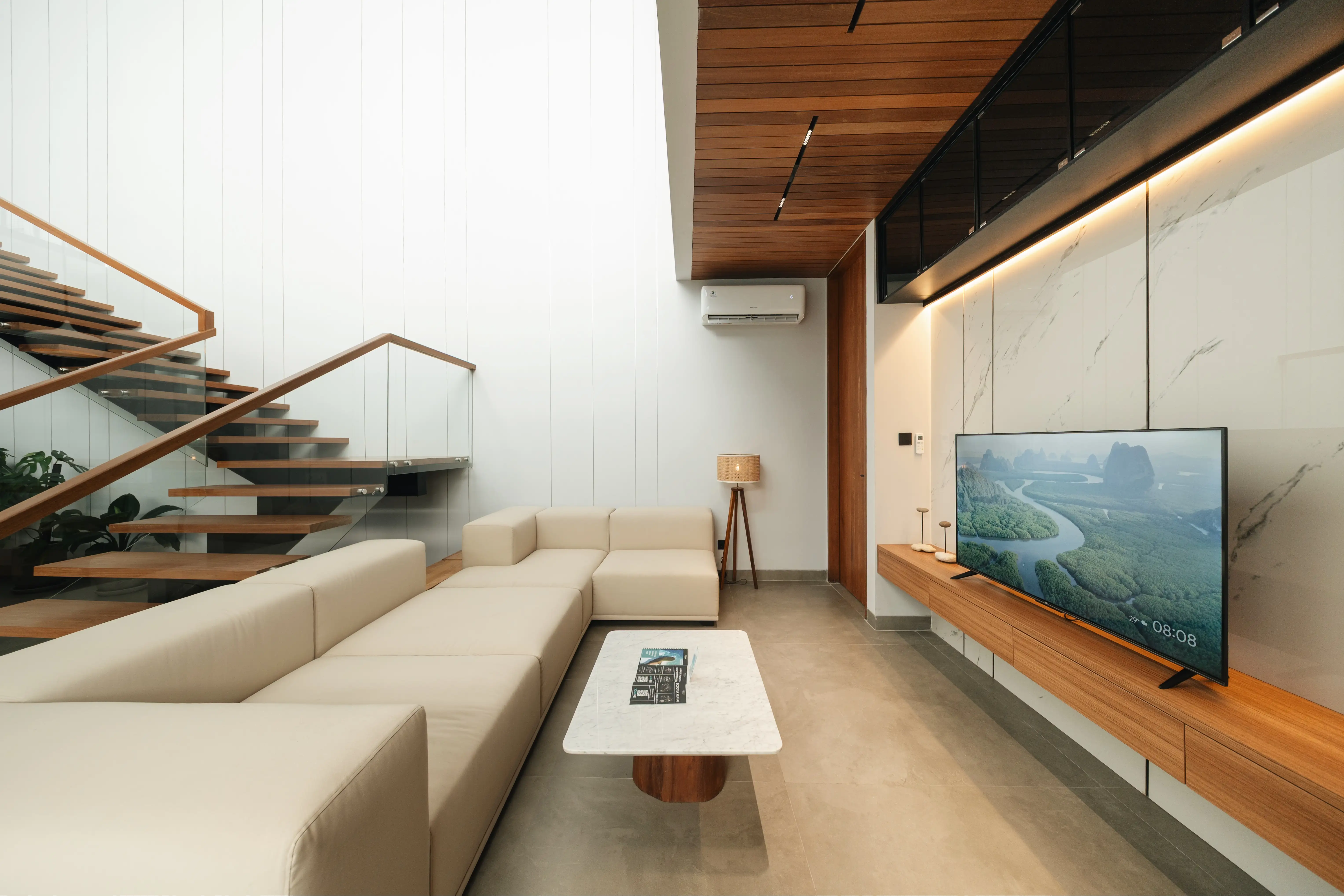 Inside, the villa features three elegant bedrooms and three bathrooms, each designed with a contemporary yet warm style using natural tones, stone accents, and wood textures. The open living and dining area includes a modern kitchen with an island counter, perfect for family meals or hosting guests. Additional facilities include a walk-in wardrobe, laundry and dry area, and a spacious lounge that overlooks the pool. The villa also offers a secure parking area for two cars, ensuring convenience for residents and visitors alike.