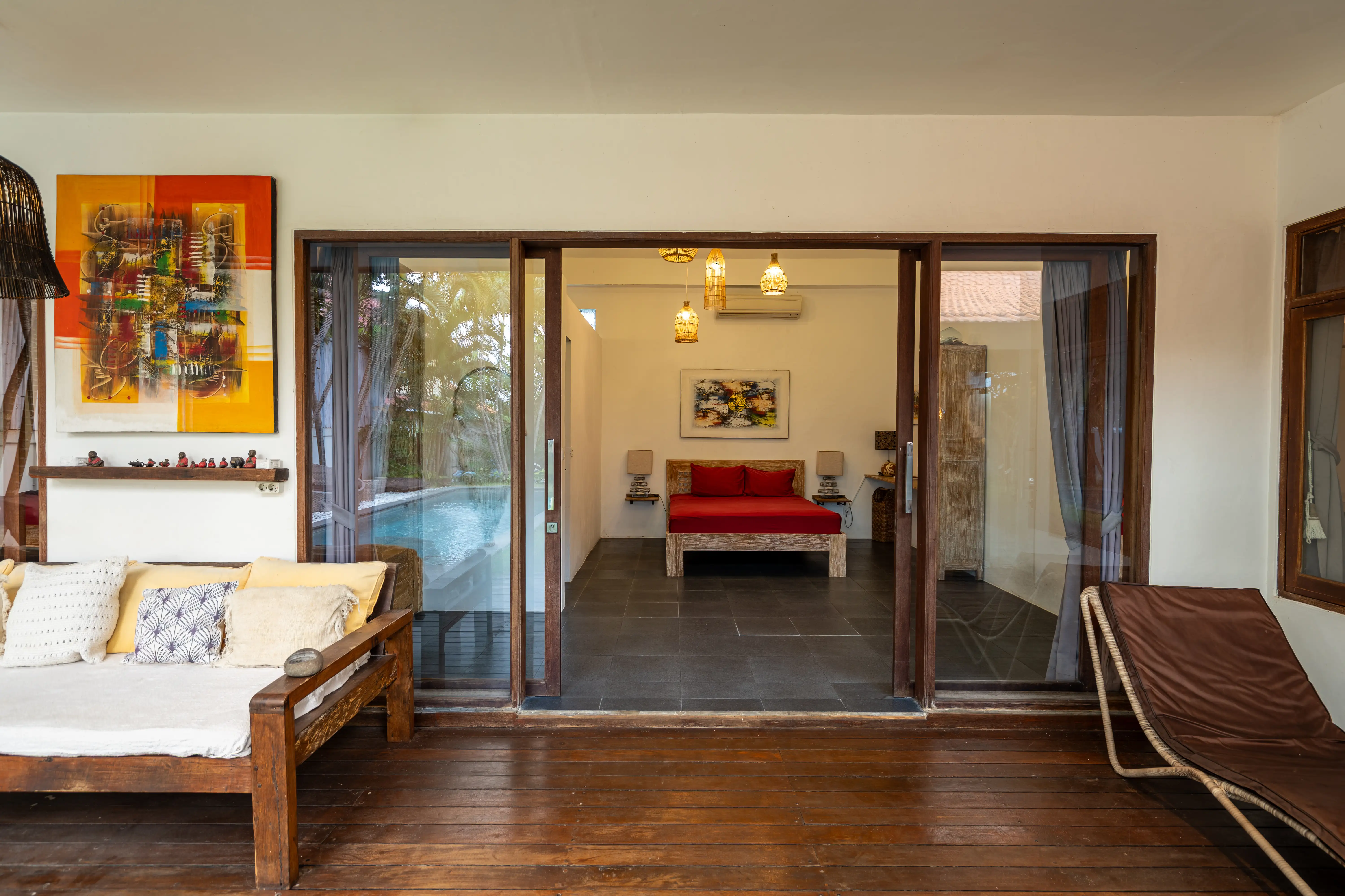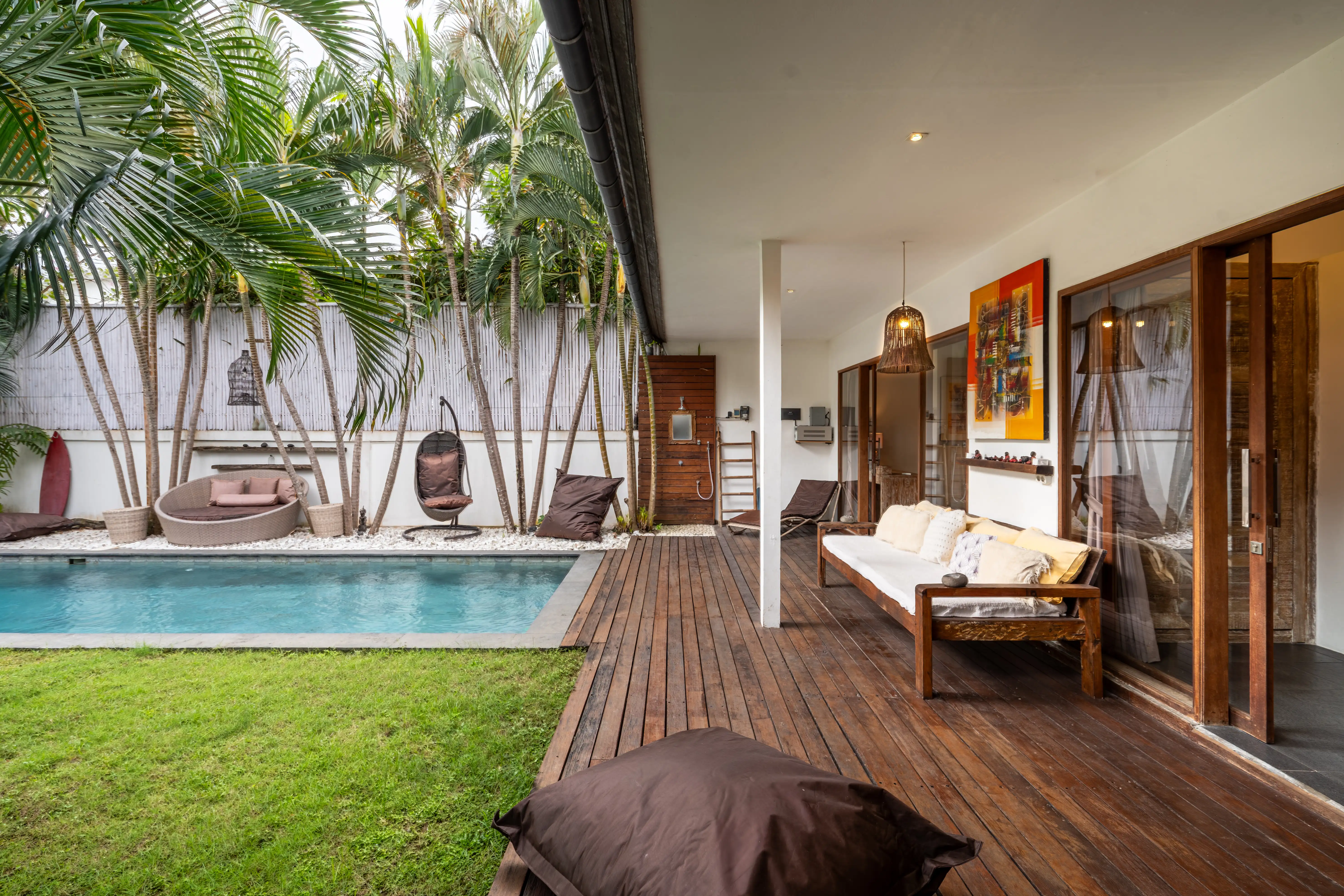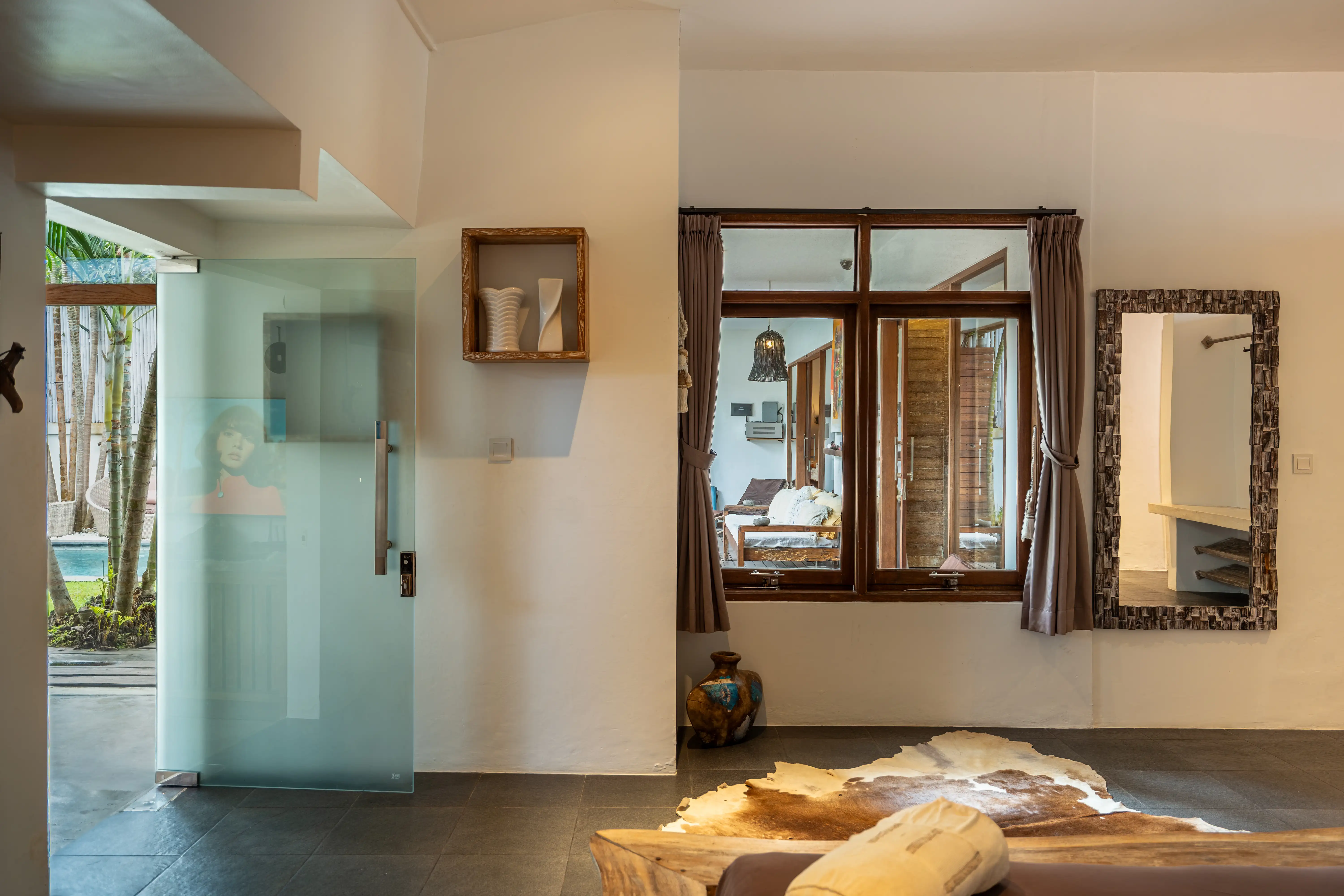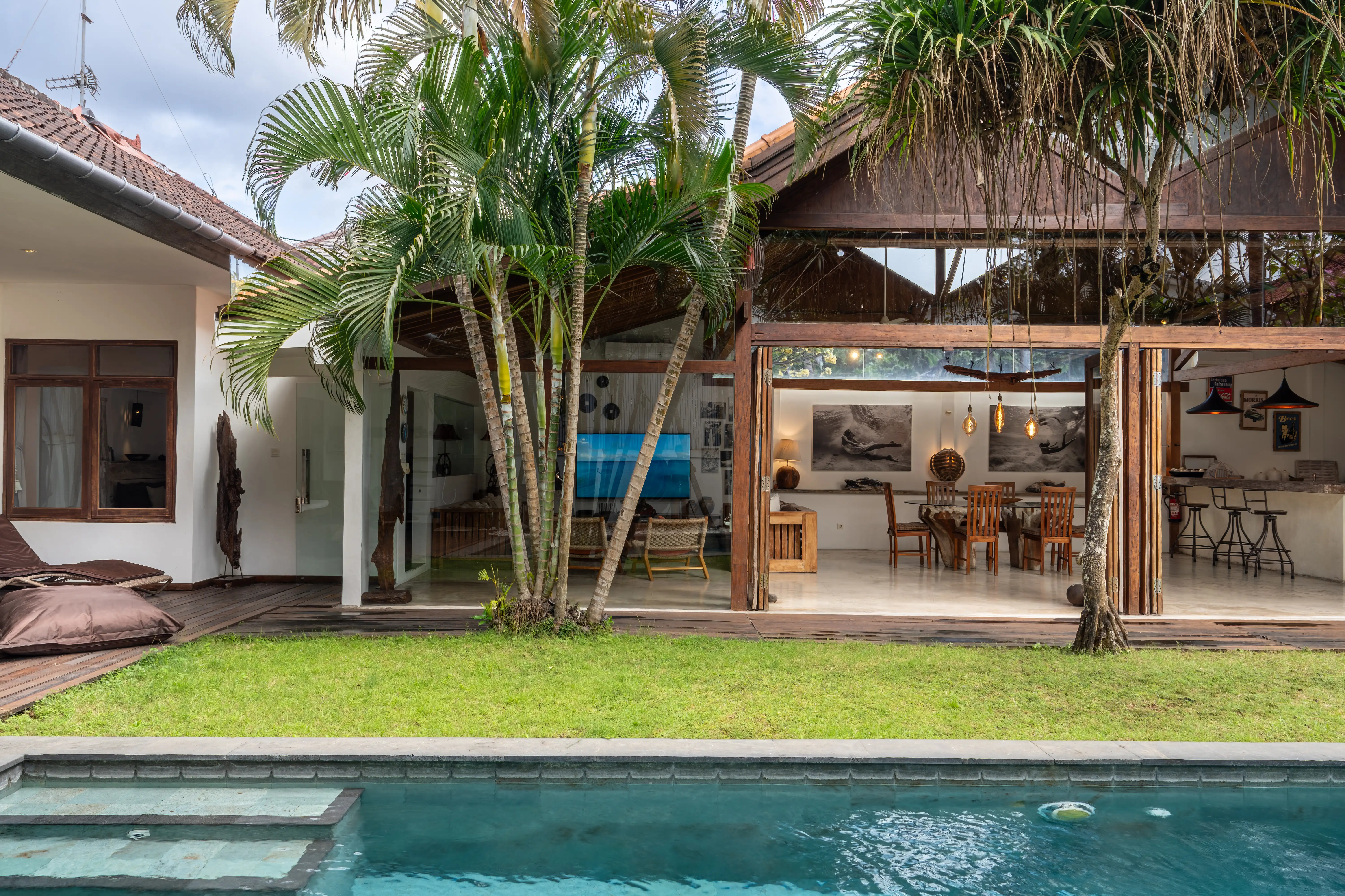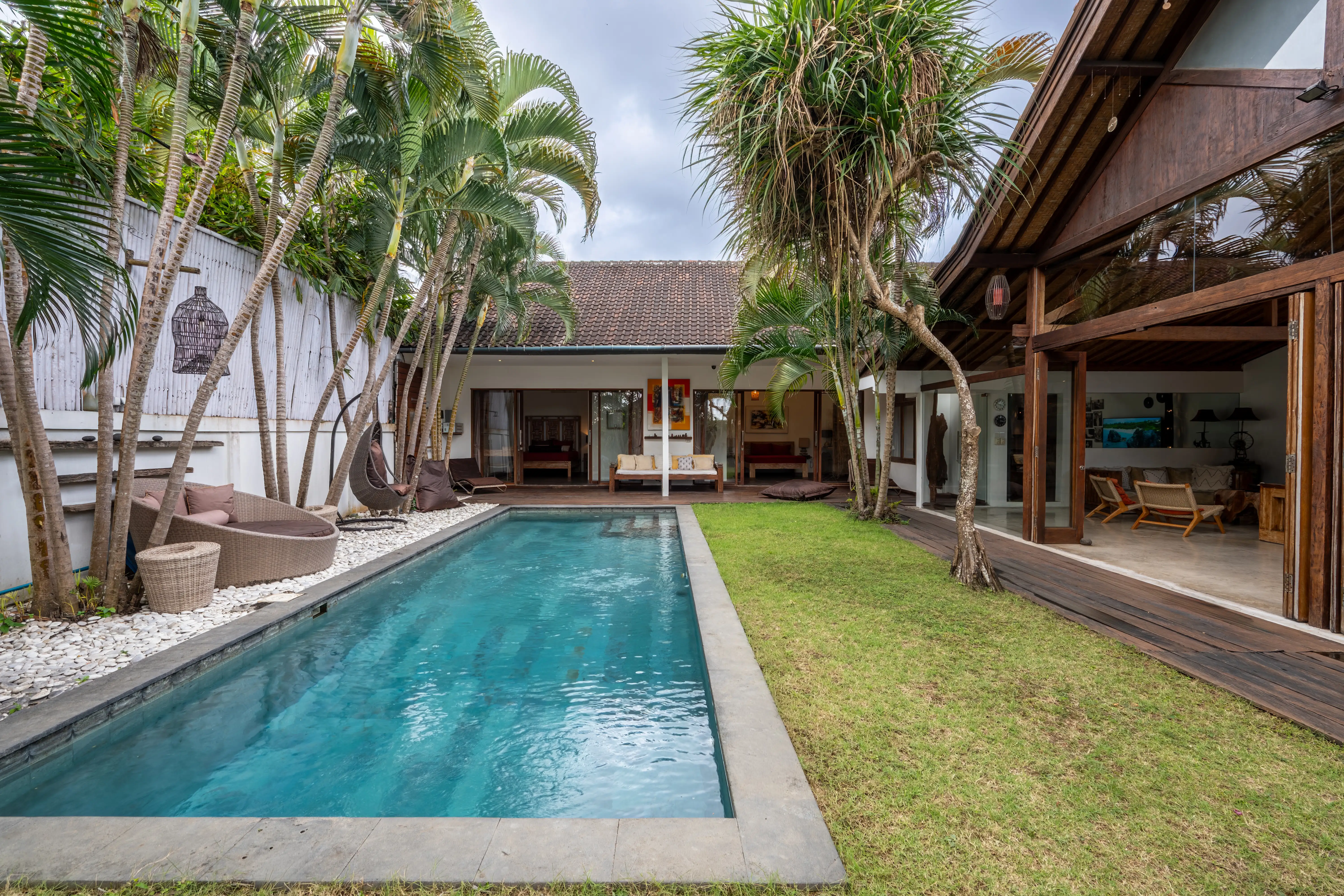 Outside, the villa opens up to a lush garden with tall palm trees and a well-maintained lawn surrounding a private swimming pool. Lounge chairs and a cozy seating area provide the ideal setting for sunbathing or unwinding under the shade. The outdoor environment has been thoughtfully landscaped for both visual appeal and privacy, offering a tranquil retreat just minutes from the vibrant energy of Seminyak. A touch of personality is evident in the eclectic décor, including curated wall art and vintage-style signage that bring character to the space.