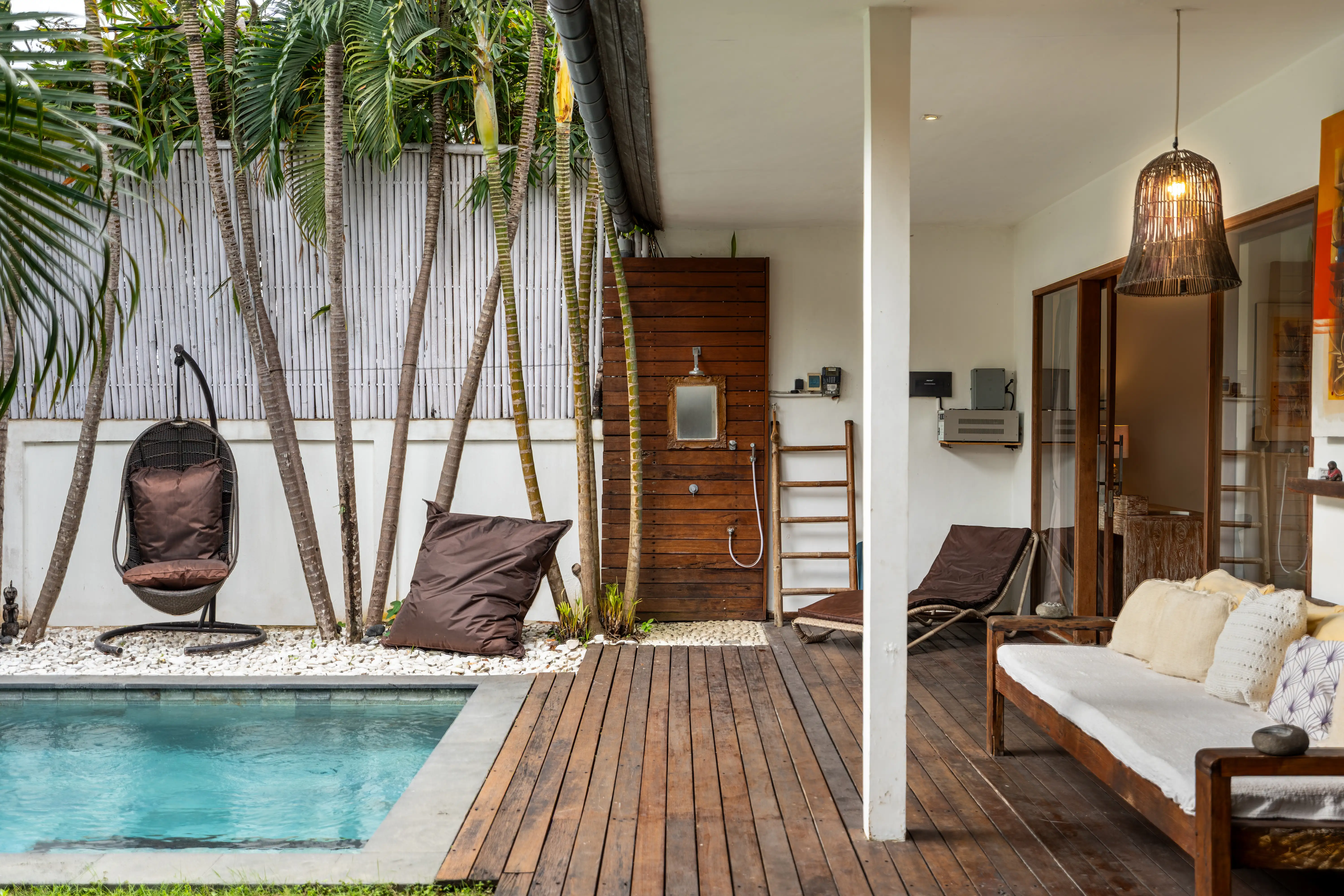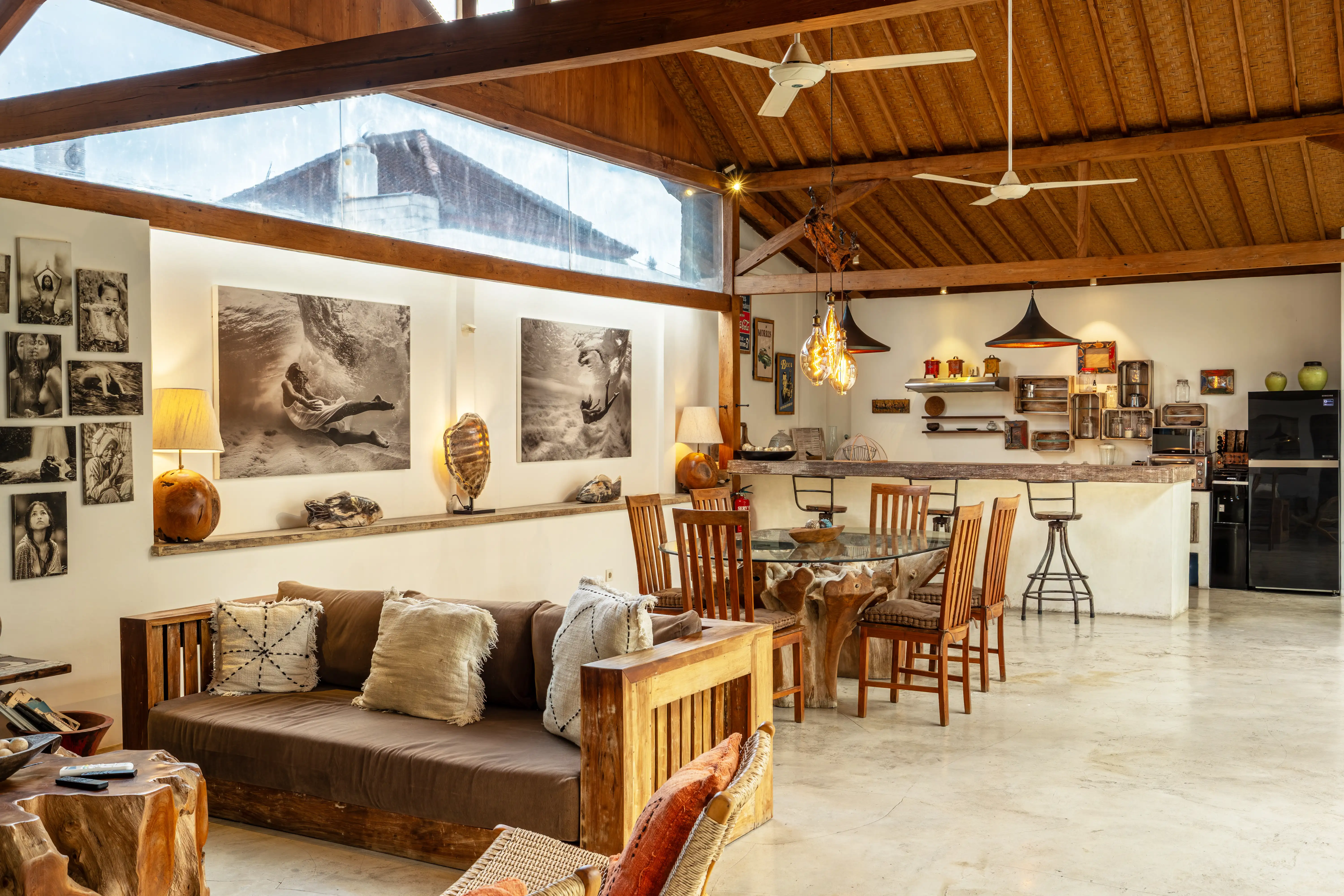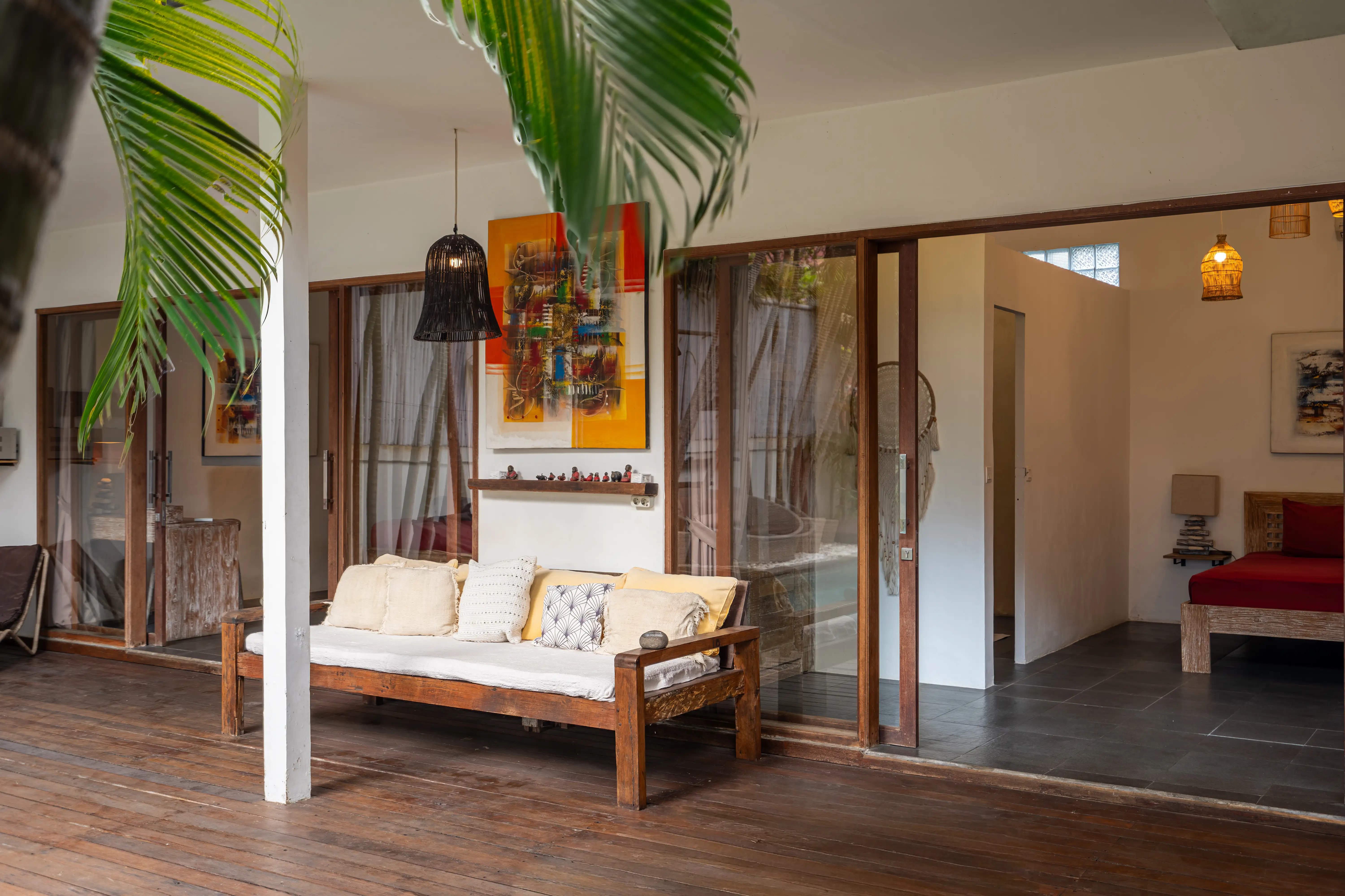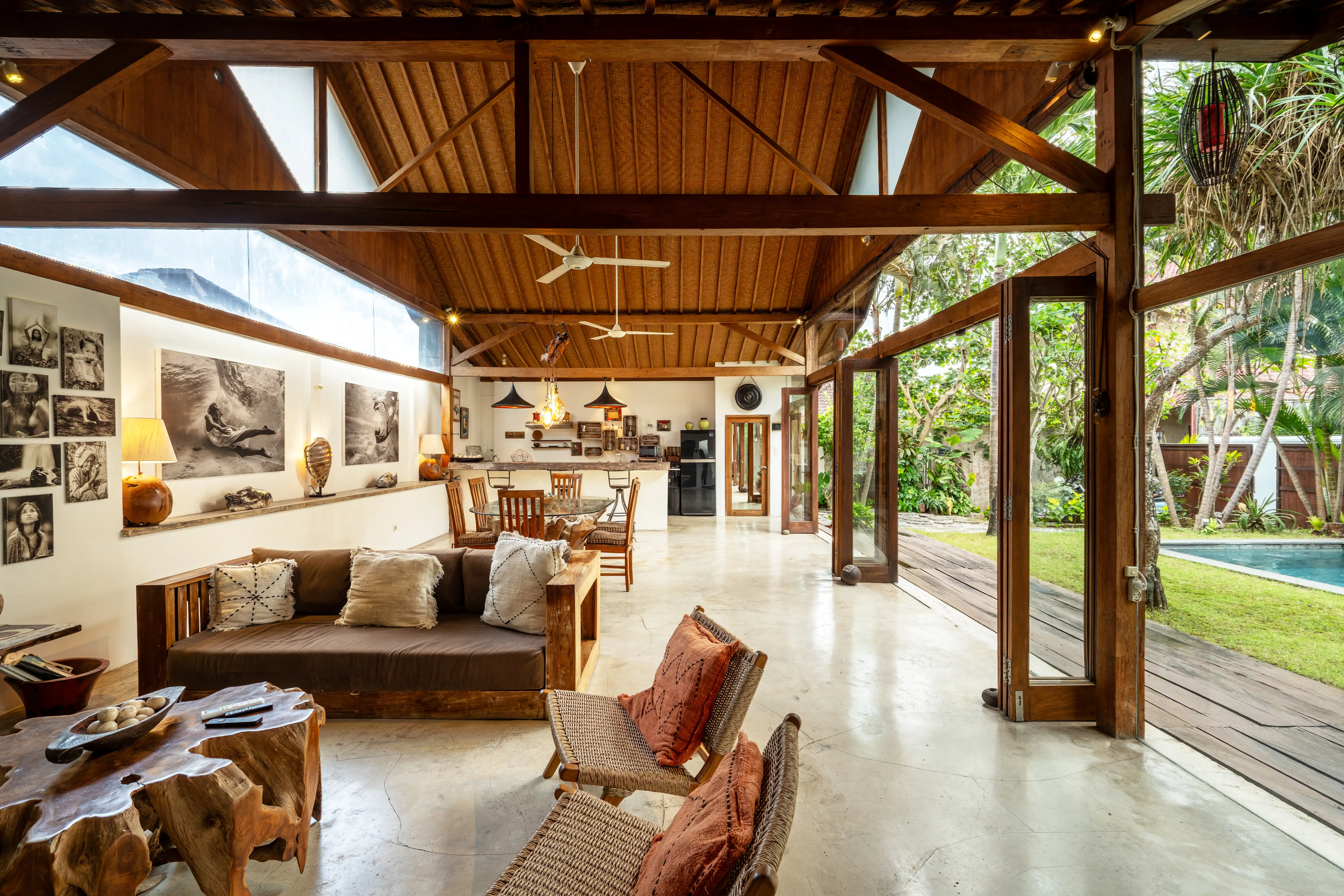Outside, the villa opens up to a lush garden with tall palm trees and a well-maintained lawn surrounding a private swimming pool. Lounge chairs and a cozy seating area provide the ideal setting for sunbathing or unwinding under the shade. The outdoor environment has been thoughtfully landscaped for both visual appeal and privacy, offering a tranquil retreat just minutes from the vibrant energy of Seminyak. A touch of personality is evident in the eclectic décor, including curated wall art and vintage-style signage that bring character to the space.