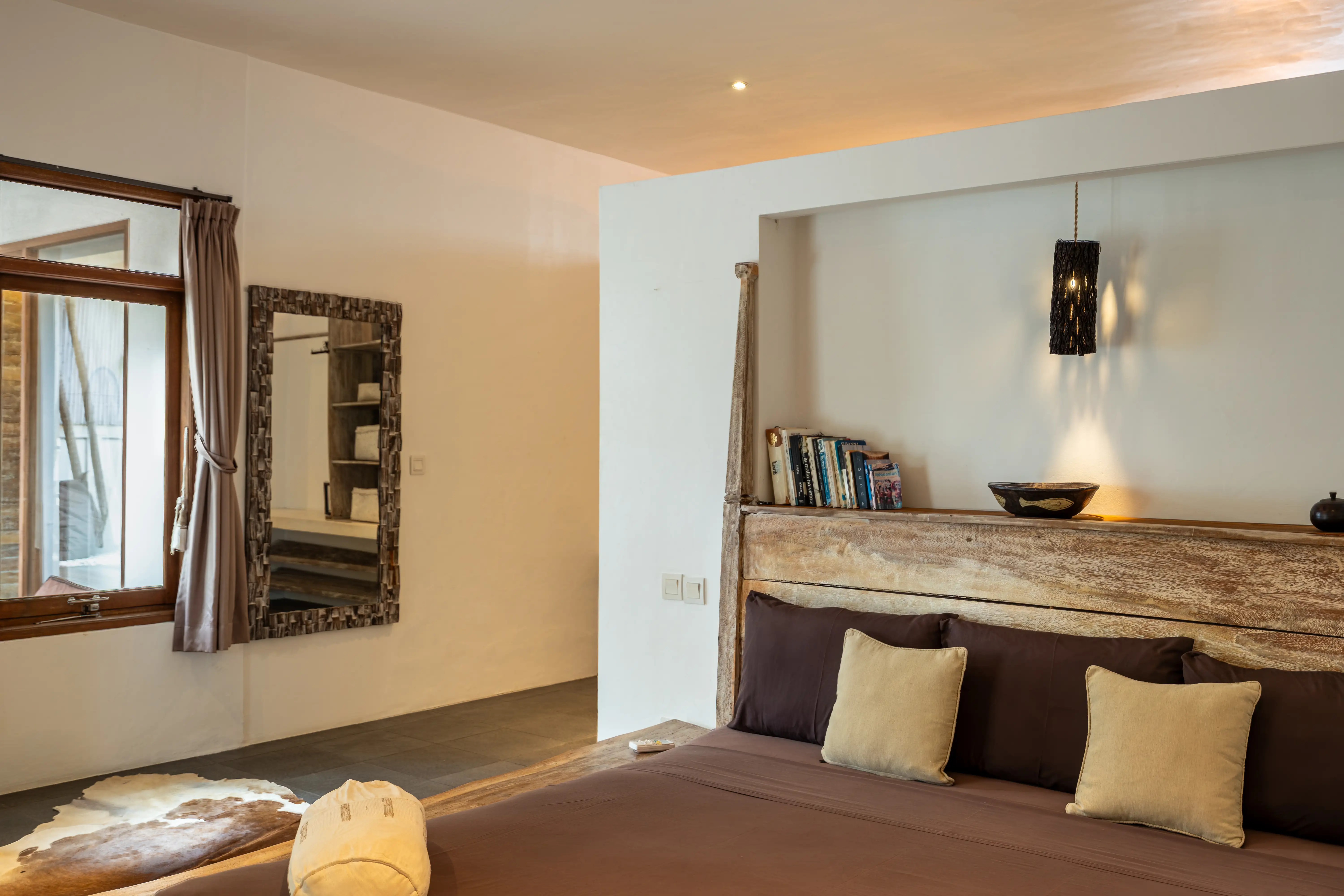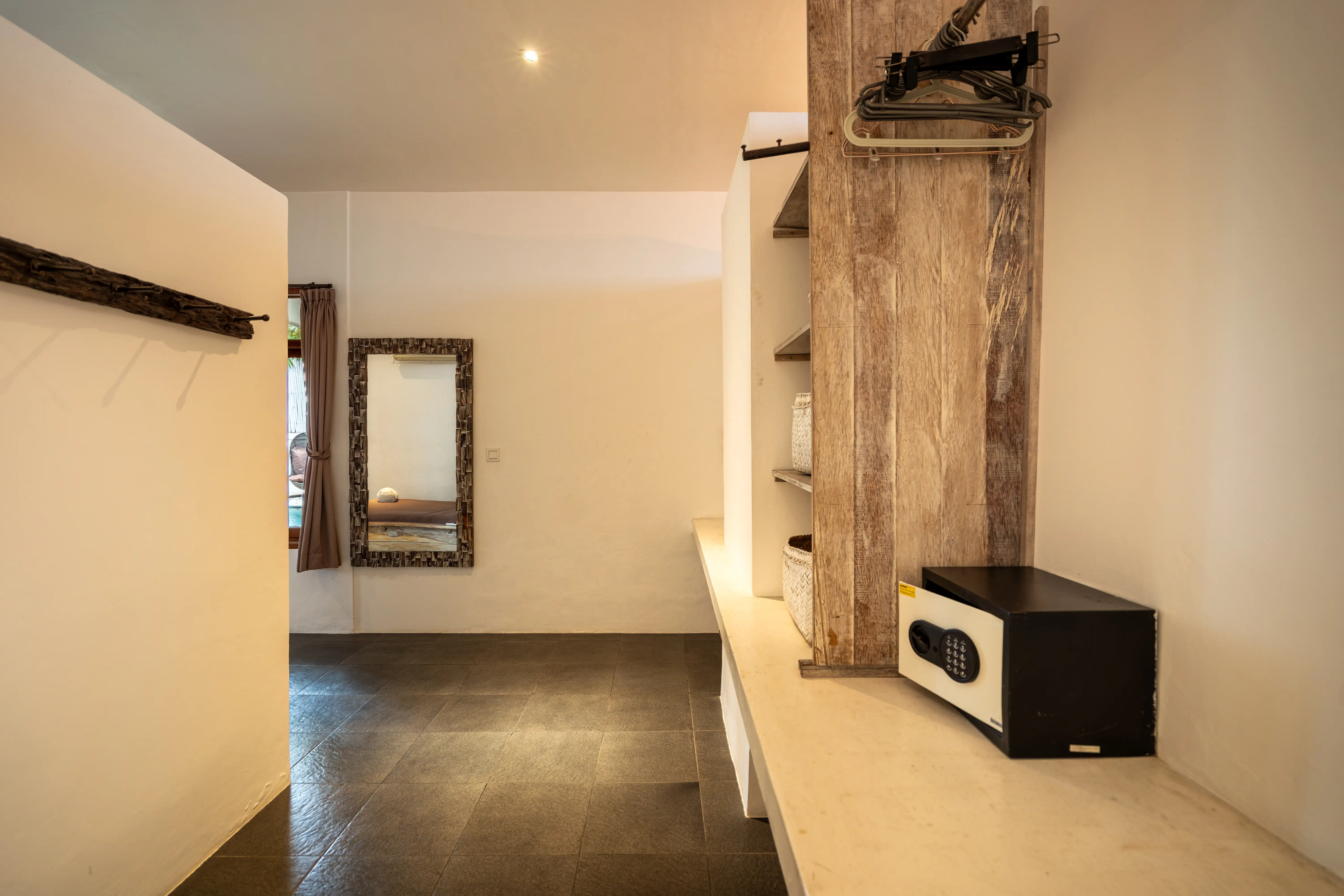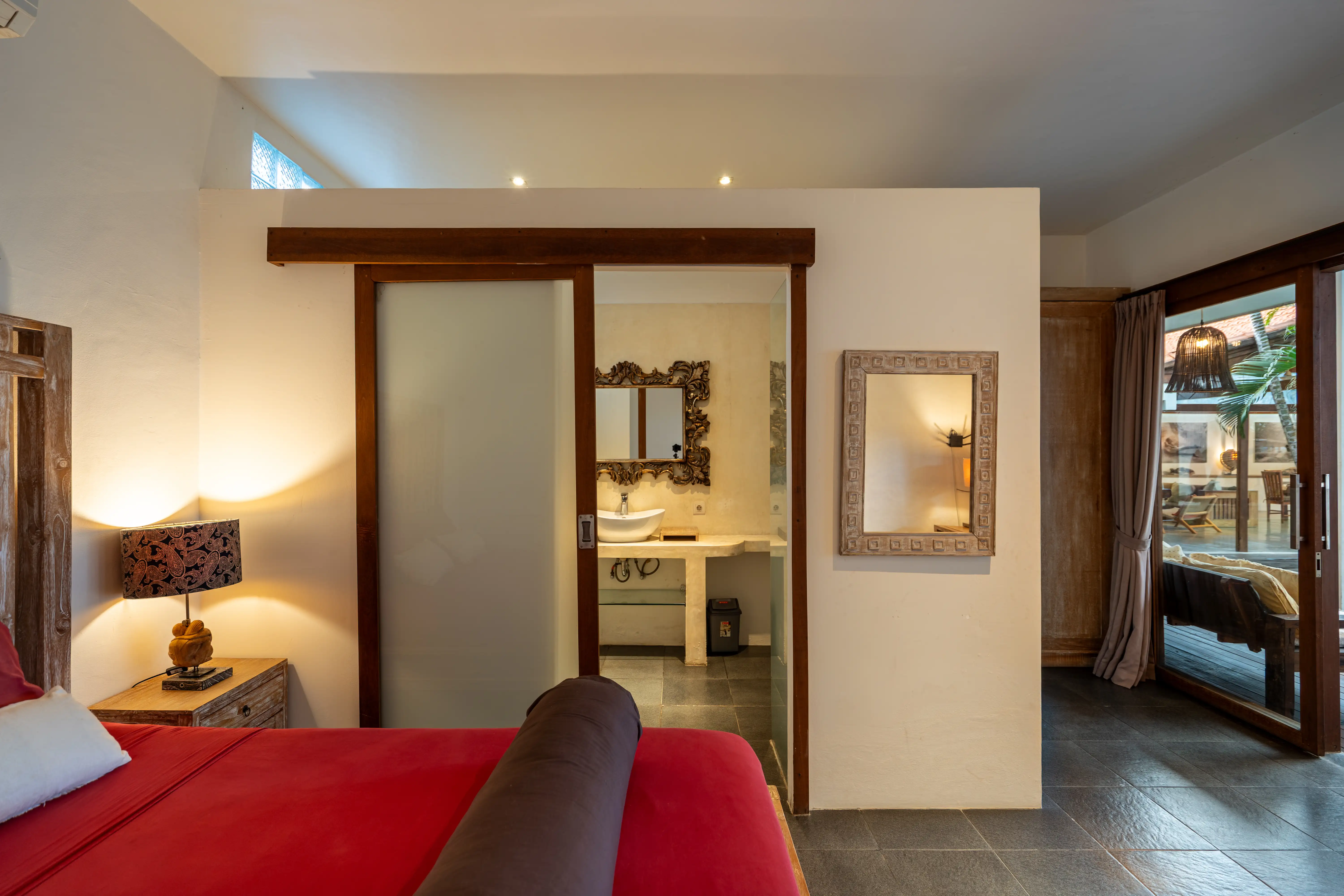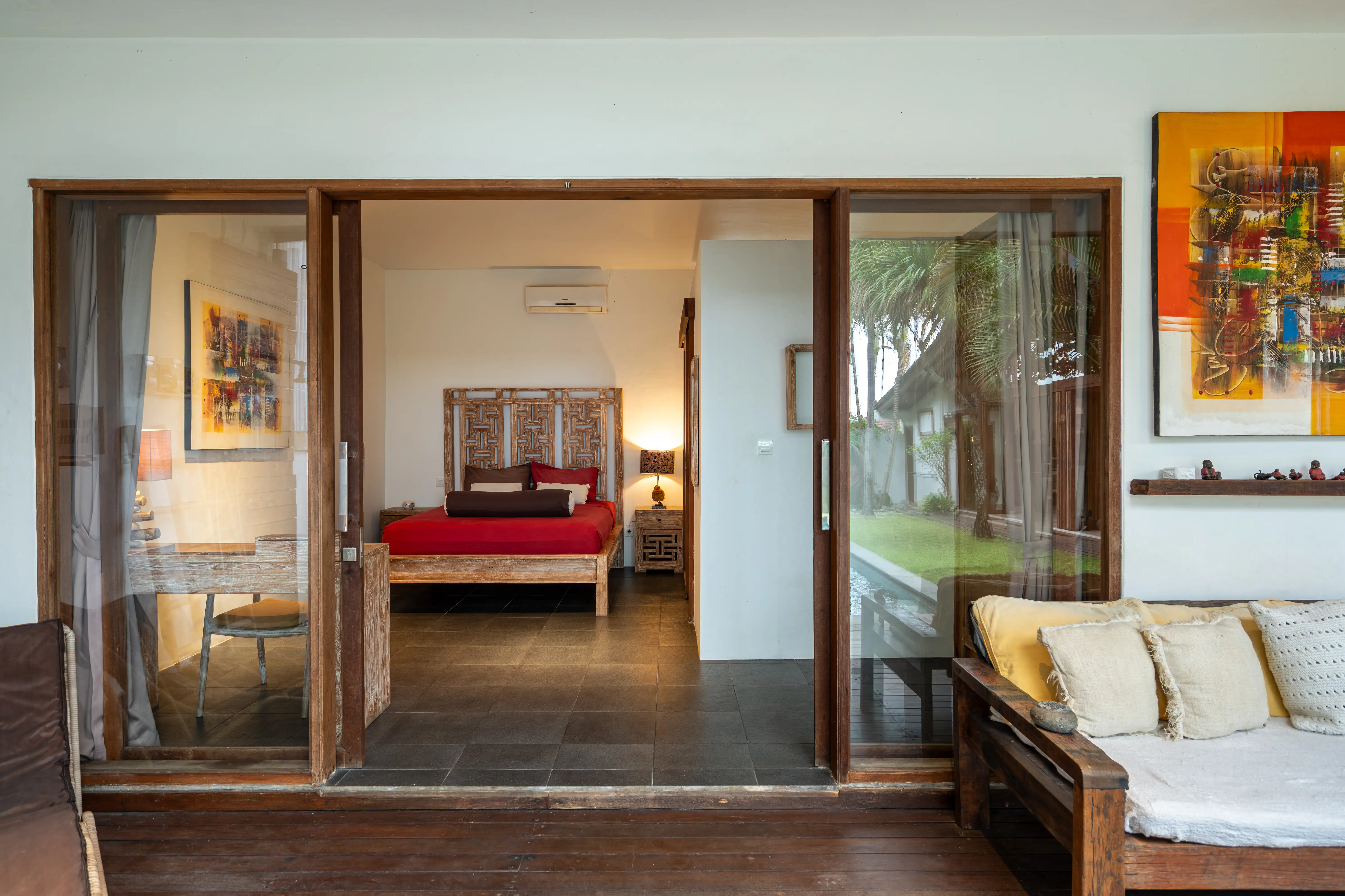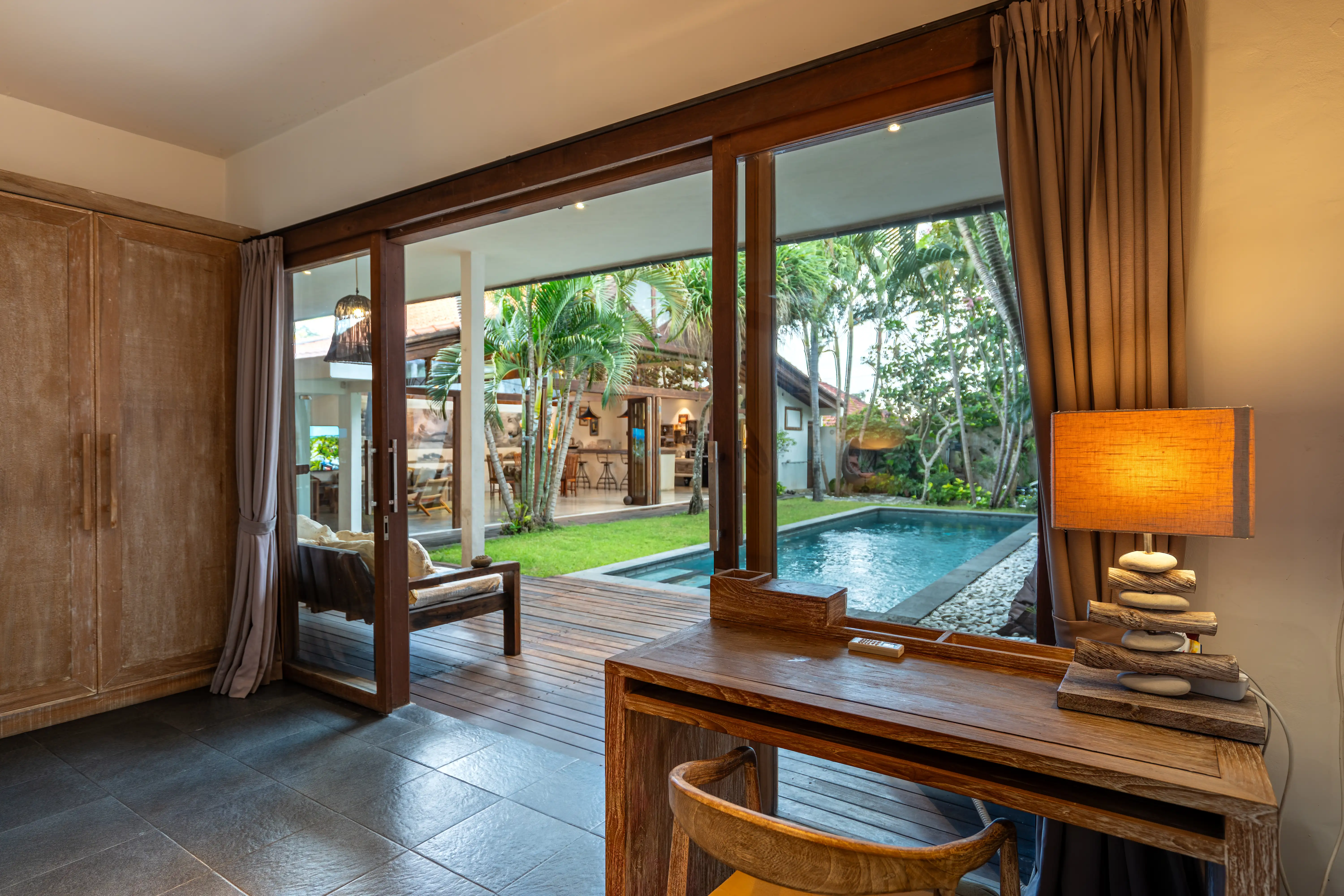 Outside, the villa opens up to a lush garden with tall palm trees and a well-maintained lawn surrounding a private swimming pool. Lounge chairs and a cozy seating area provide the ideal setting for sunbathing or unwinding under the shade. The outdoor environment has been thoughtfully landscaped for both visual appeal and privacy, offering a tranquil retreat just minutes from the vibrant energy of Seminyak. A touch of personality is evident in the eclectic décor, including curated wall art and vintage-style signage that bring character to the space.