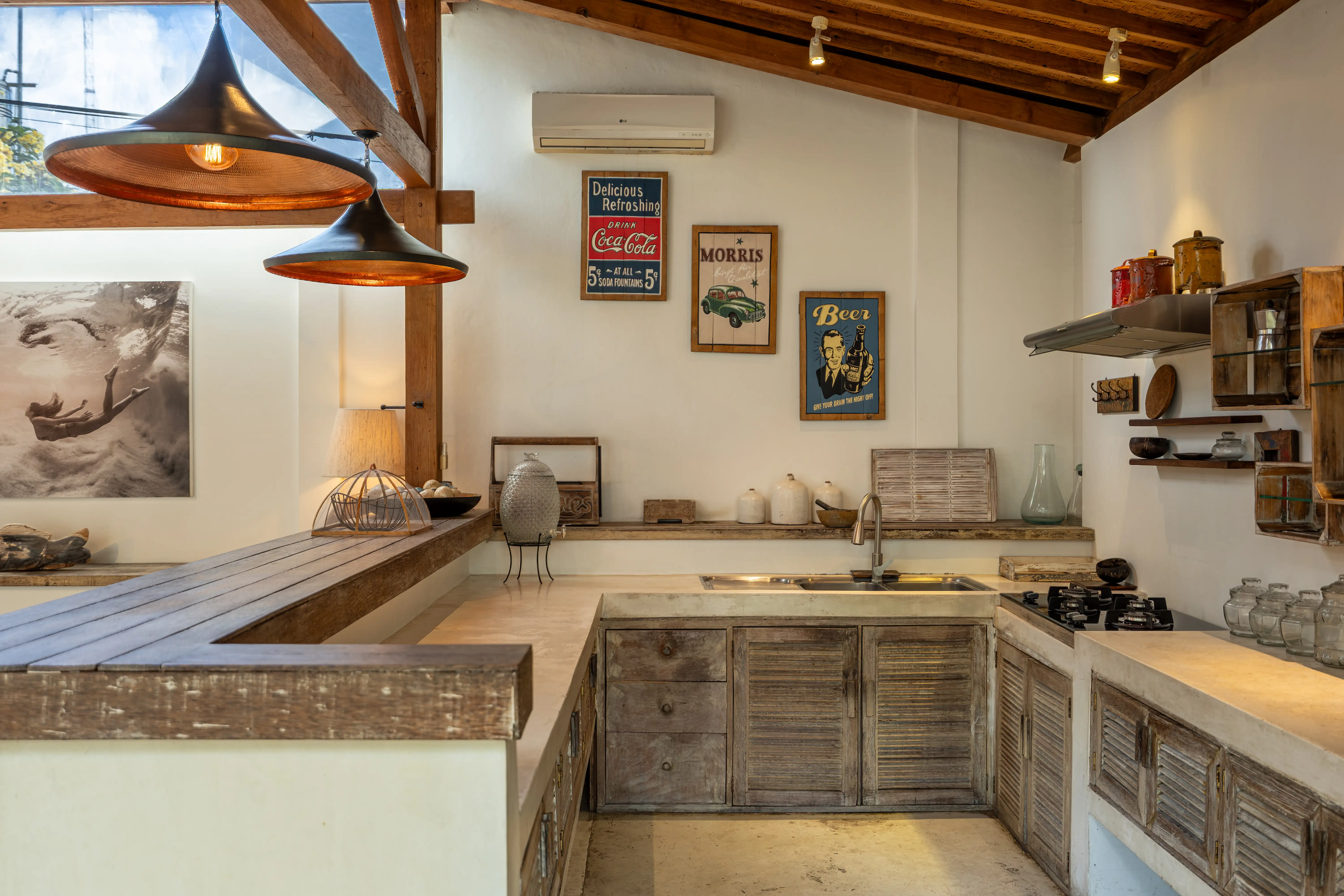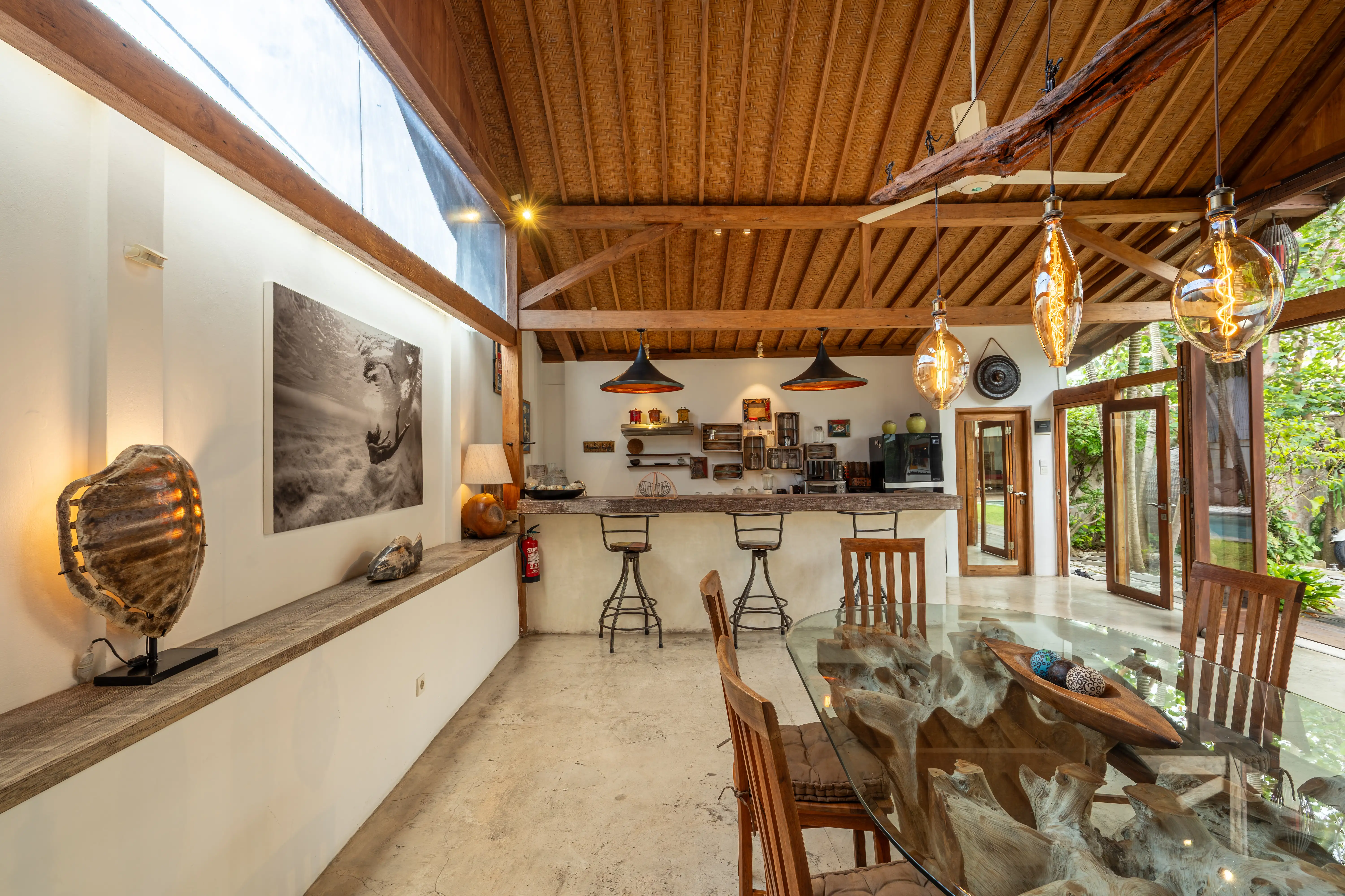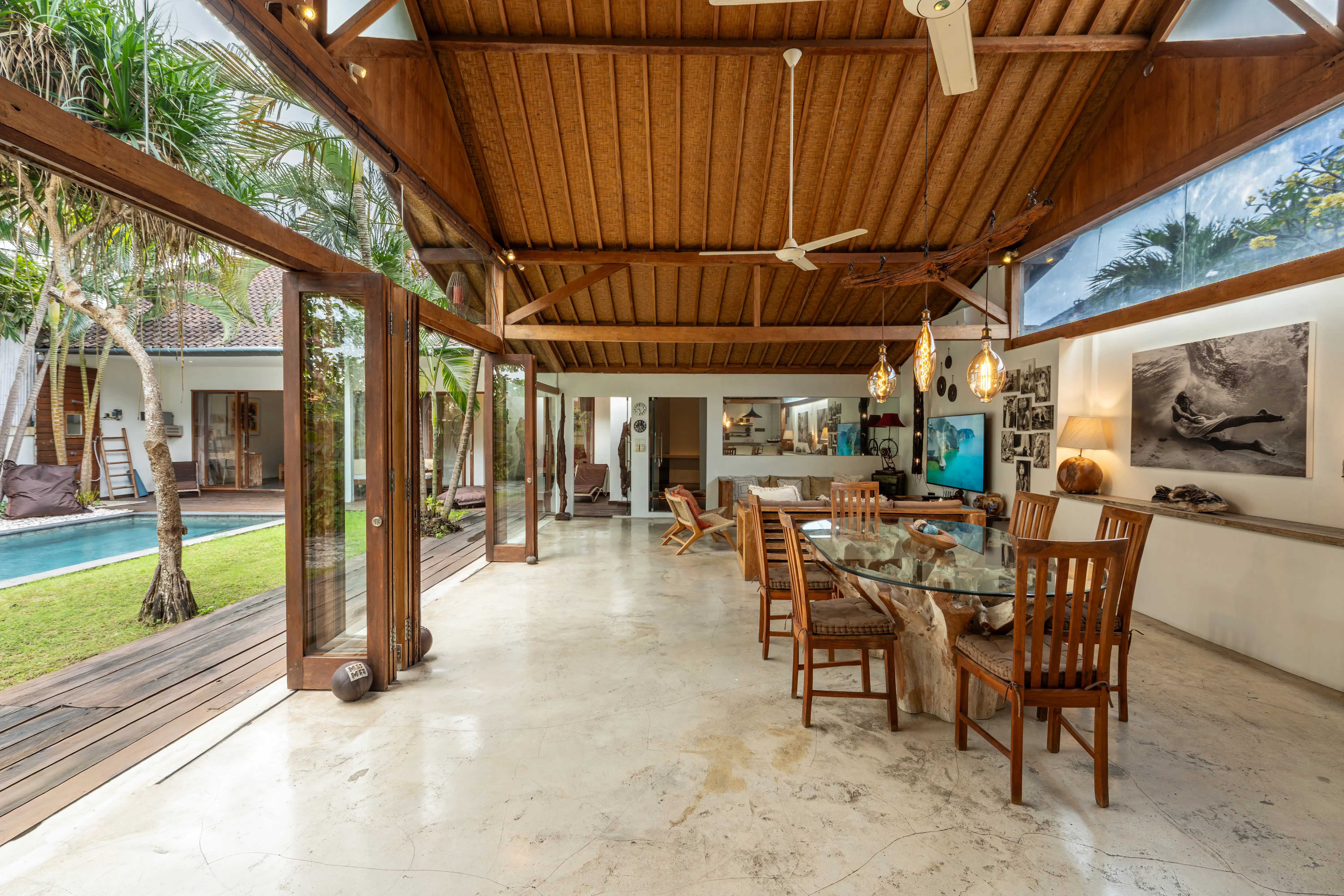 Nestled in the heart of Kerobokan, this beautifully designed 3-bedroom villa offers the perfect combination of tropical charm and modern functionality that has been fully renovated in 2016. Set on a generous 400 sqm plot, the property features a spacious open-plan living area with high wooden ceilings, allowing for abundant natural light and seamless indoor-outdoor flow. The interiors showcase a blend of rustic elements with clean white walls and exposed timber beams, creating a warm and relaxed atmosphere. A fully equipped kitchen with handcrafted shelving and a breakfast bar invites shared meals and social gatherings.