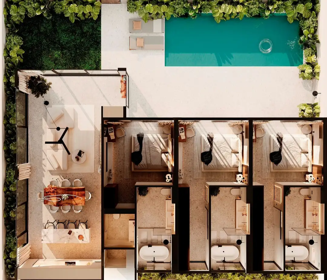 These leasehold villas offer a more spacious single-level layout within a well-managed residential complex, built on a 188 sqm land with building sizes ranging from 261 and 314 sqm. Available in three- and four-bedroom configurations, each bedroom comes with its own bathroom featuring a bathtub, providing a higher level of comfort for longer stays. The villas are fully furnished with a modern design, enclosed living room, equipped kitchen, private pool, and a generously sized garden that enhances privacy and outdoor living.