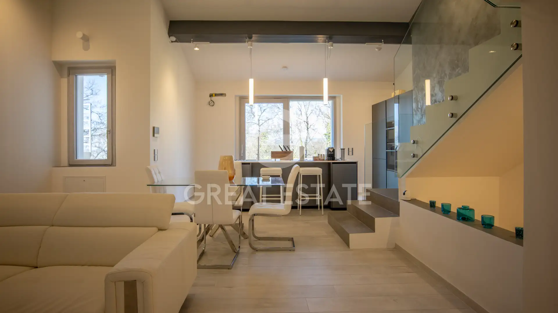 On the ground floor, a spacious open-plan layout seamlessly connects the fully furnished induction kitchen with the living area, featuring an electric fireplace and a bar corner, creating a warm and inviting atmosphere ideal for entertaining friends and family. This level also includes a bathroom, a technical room, and a versatile multipurpose room, a flexible space that can be transformed into a private spa, a second living room, a gym, or a dedicated wellness and relaxation area.