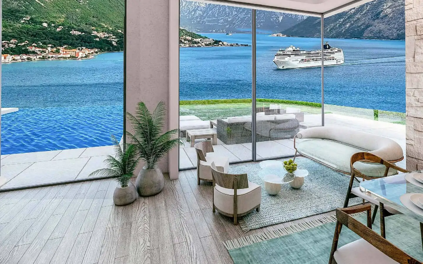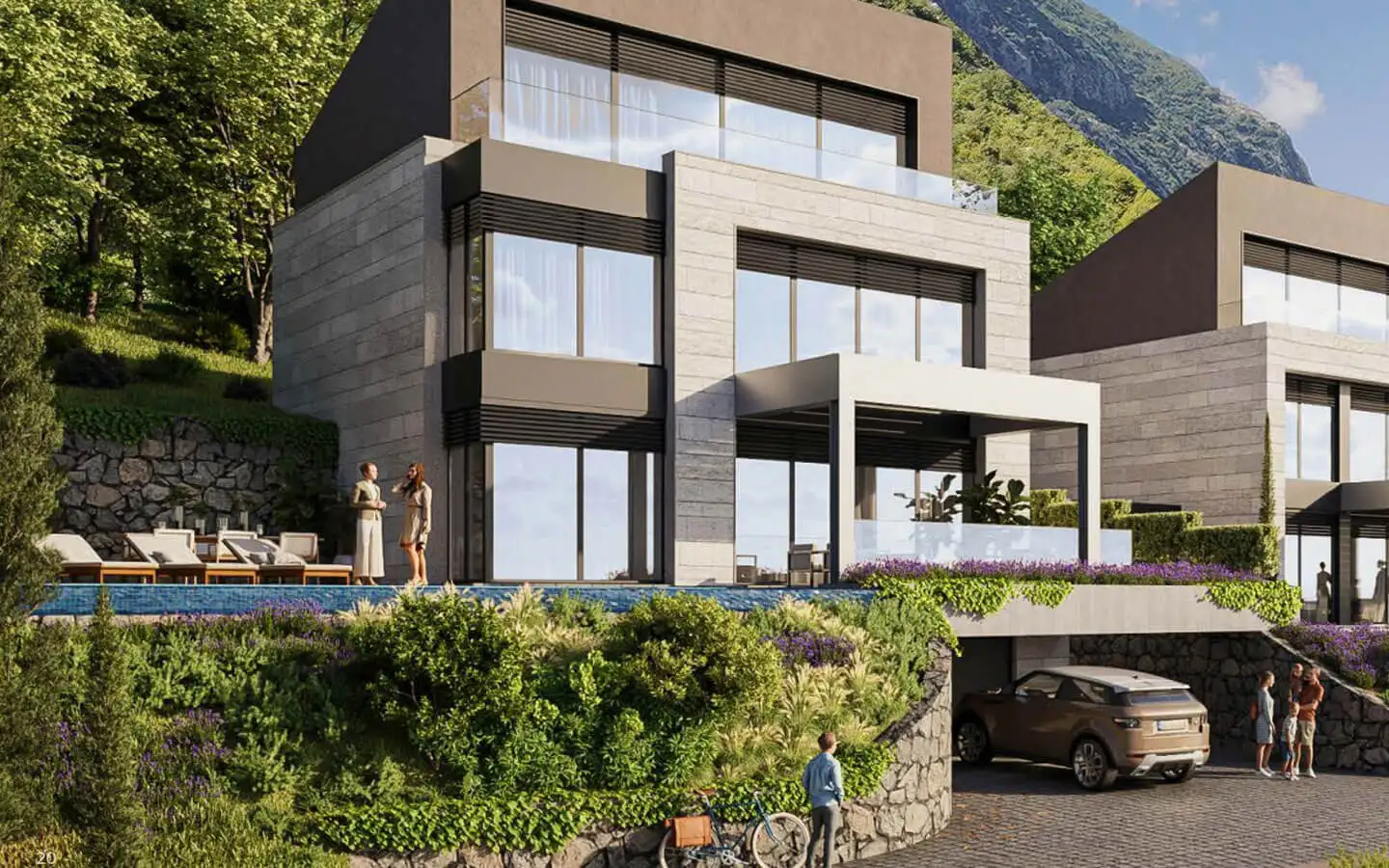 All villas feature unobstructed views of the Bay of Kotor from living areas and bedrooms, private swimming pools and outdoor relaxation areas, two-car garages, high-quality construction, modern architectural design, and spacious plots that ensure privacy and comfort.